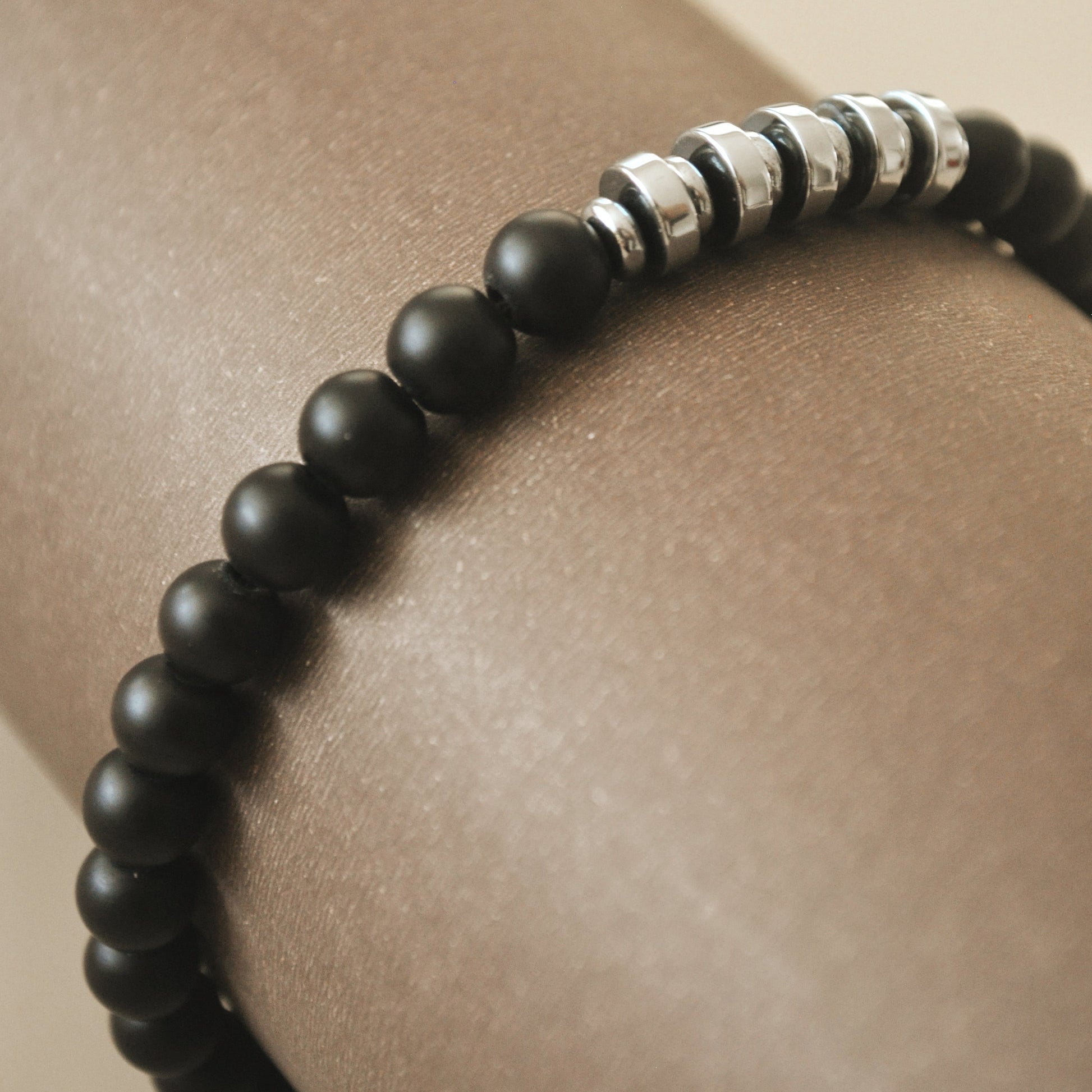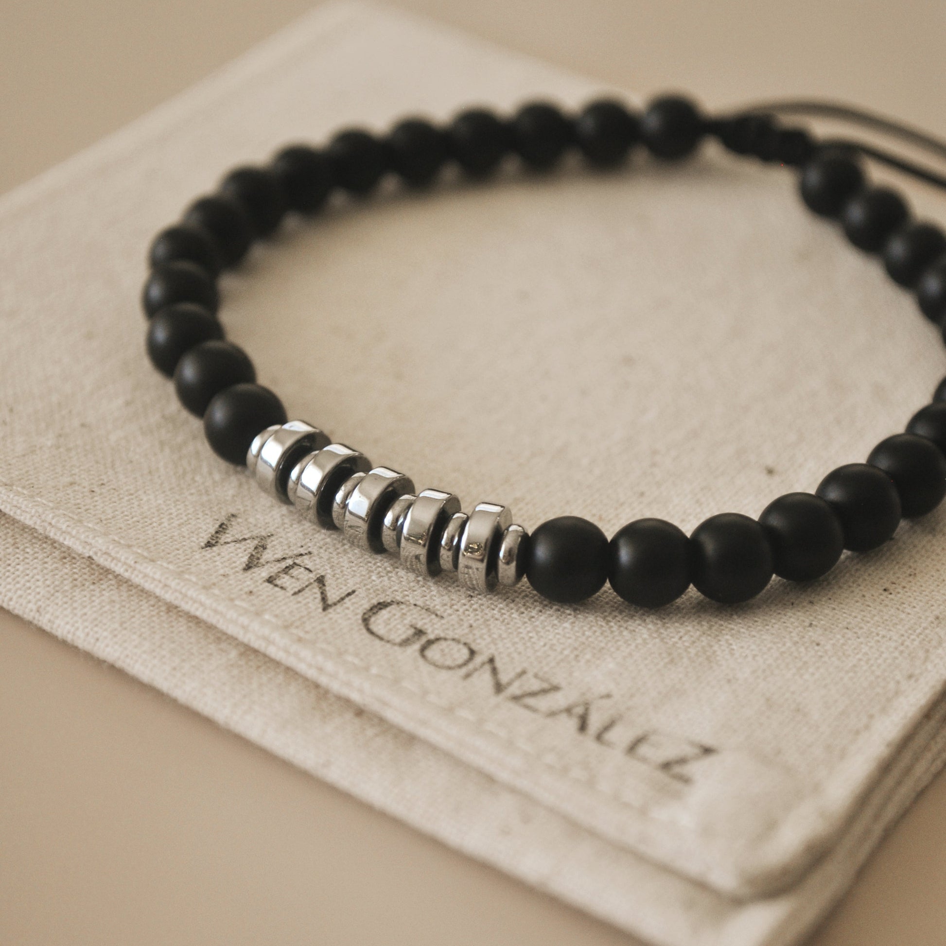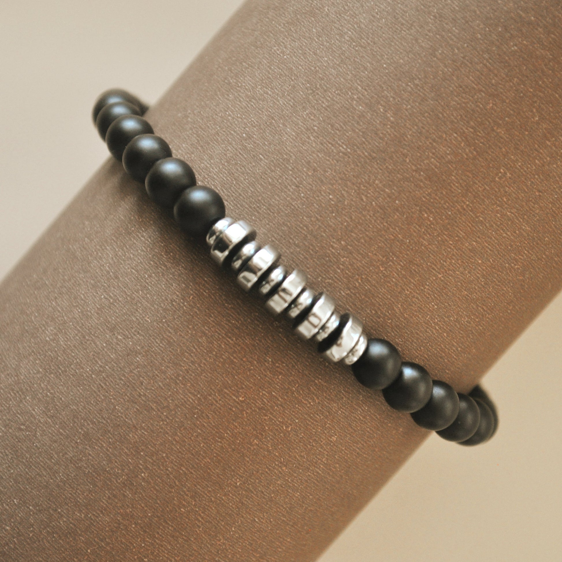 Brazalete ajustable de piedra natural onix mate con separadores de acero inoxidable.