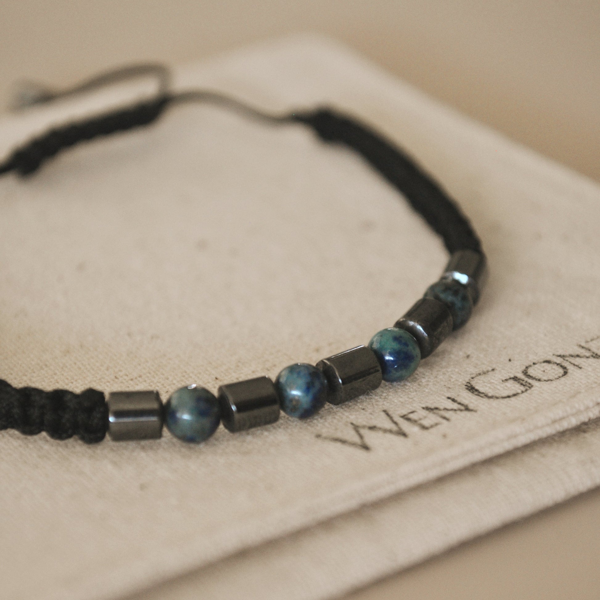 Brazalete ajustable de tejido con hilo, piedra Azurite de 4mm y Acerina de 5mm.