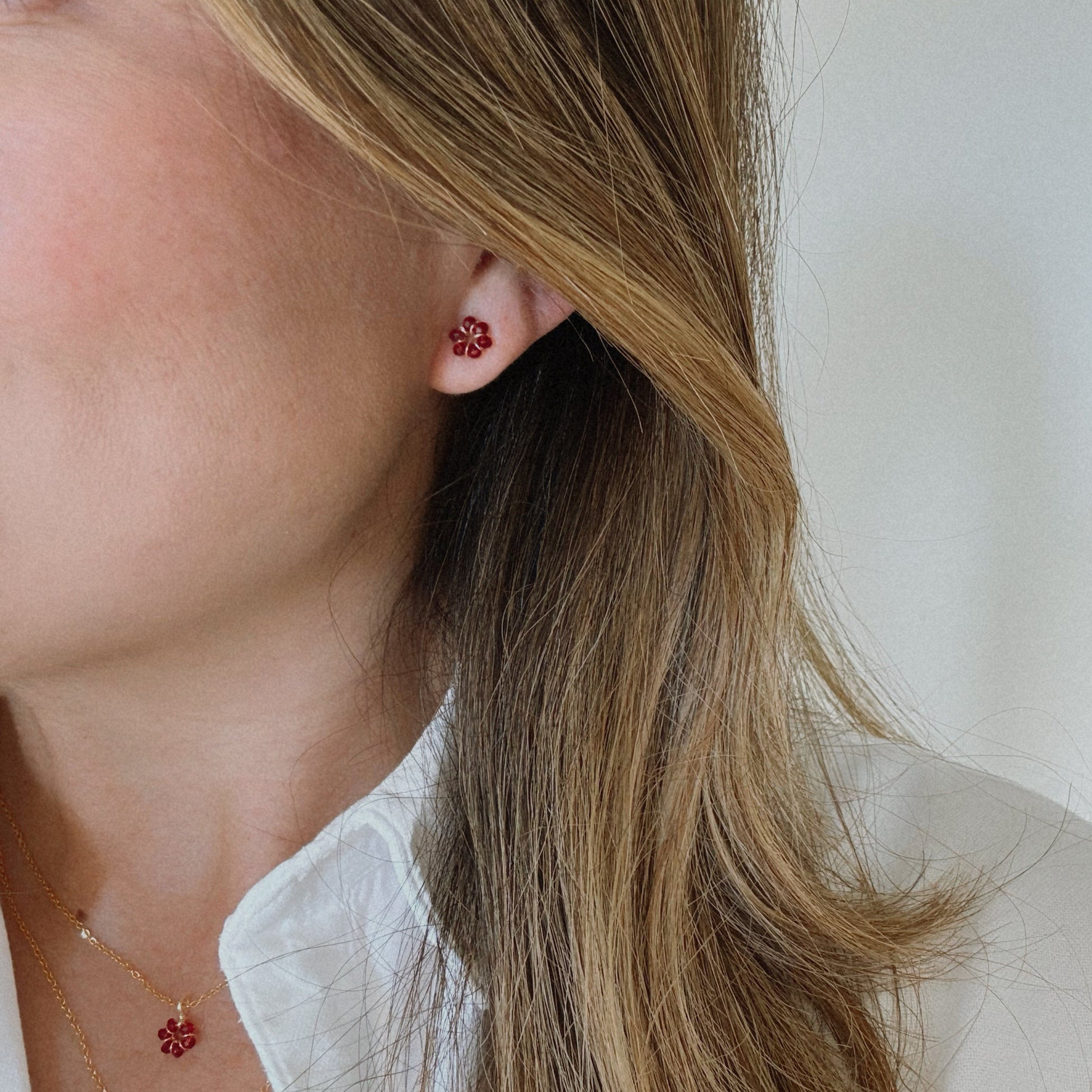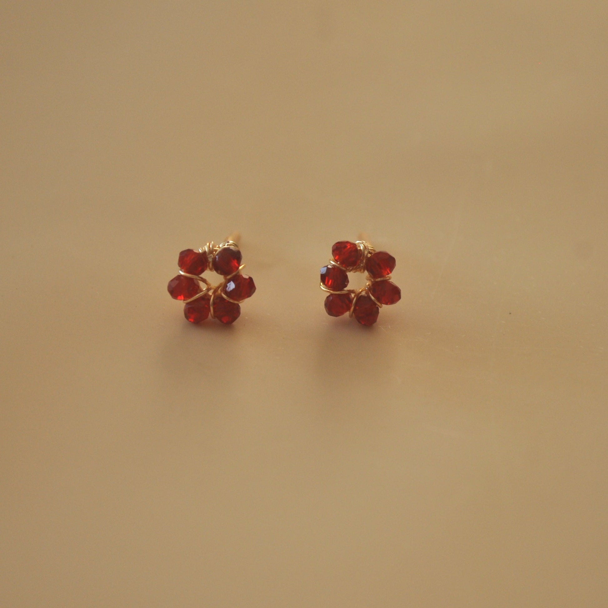 Hecho a mano con cristales color rubí y técnica alambrismo con baño de oro de 18K, son piezas hipoalergénicas que no destiñen. Livianos, tamaño de 0.9cm-1cm.