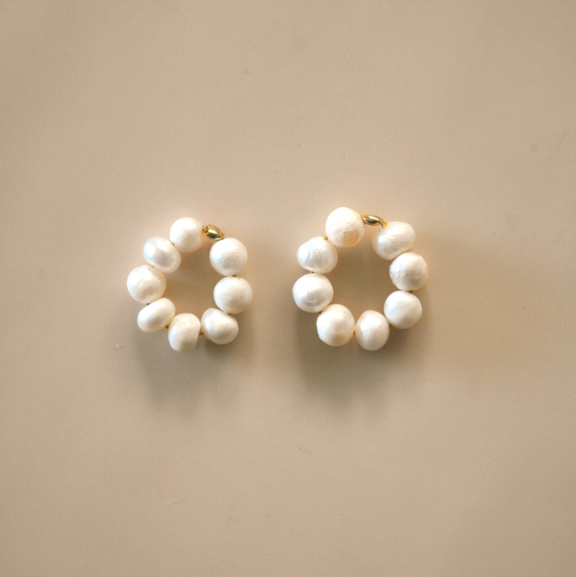 Hecho a mano con perlas de 4 mm. Intercambia fácilmente los dijes de tus aretes con nuestros hoops de acero inoxidable en oro de 14k de 15 mm.