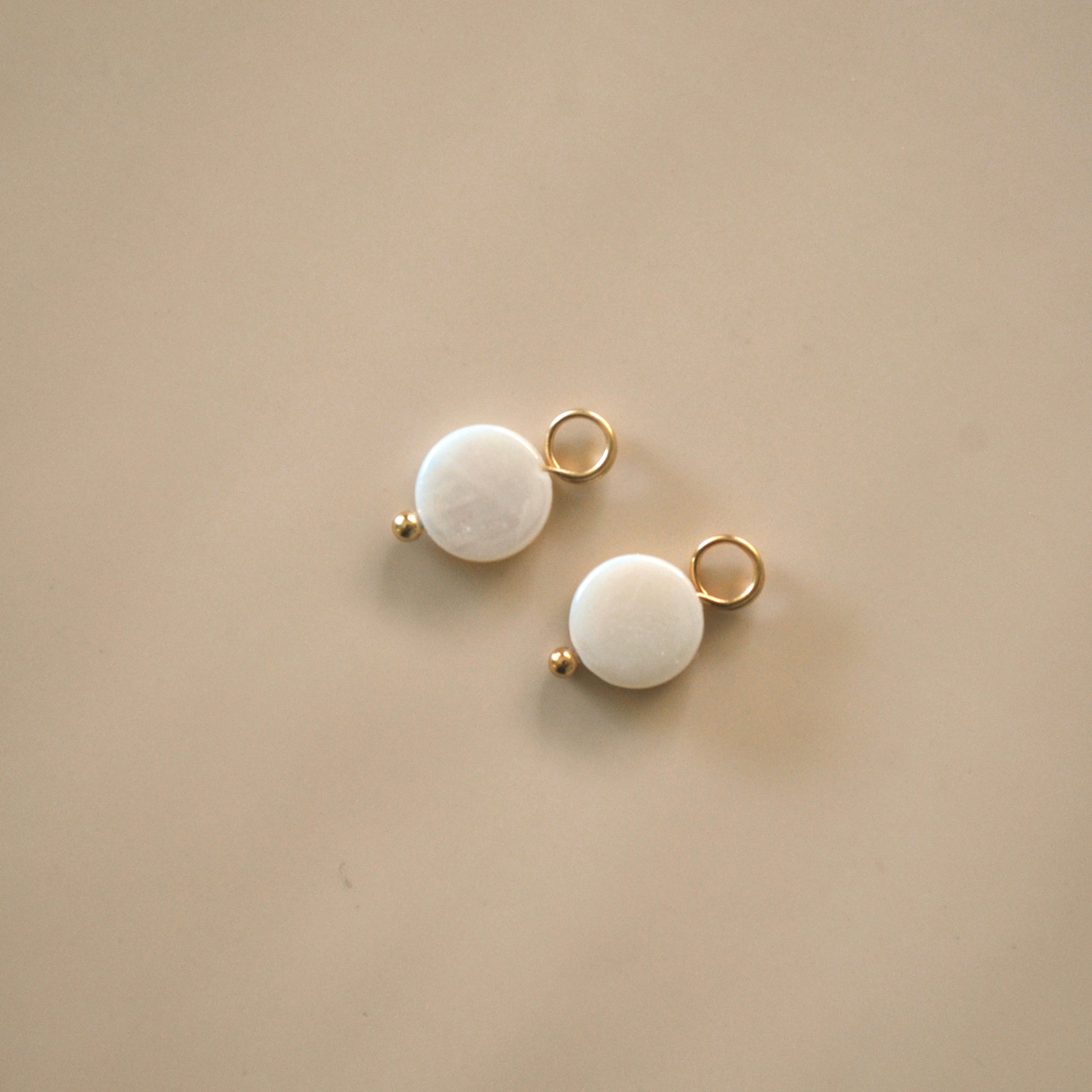 Hecho a mano con perlas y con herrajes de acero inoxidable en oro de 14k. Intercambia fácilmente los dijes de tus aretes con nuestros hoops de acero inoxidable en oro de 14k de 15 mm.
