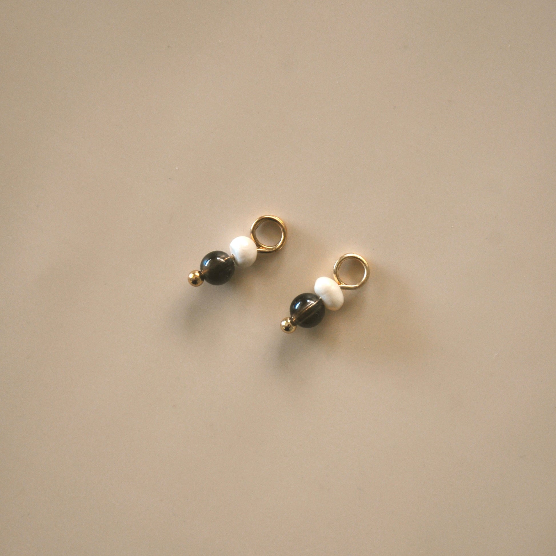 Hecho a mano con piedras de Cuarzo Ahumado de 4 mm y perlas con herrajes de acero inoxidable en oro de 14k. Intercambia fácilmente los dijes de tus aretes con nuestros hoops de acero inoxidable en oro de 14k de 15 mm.