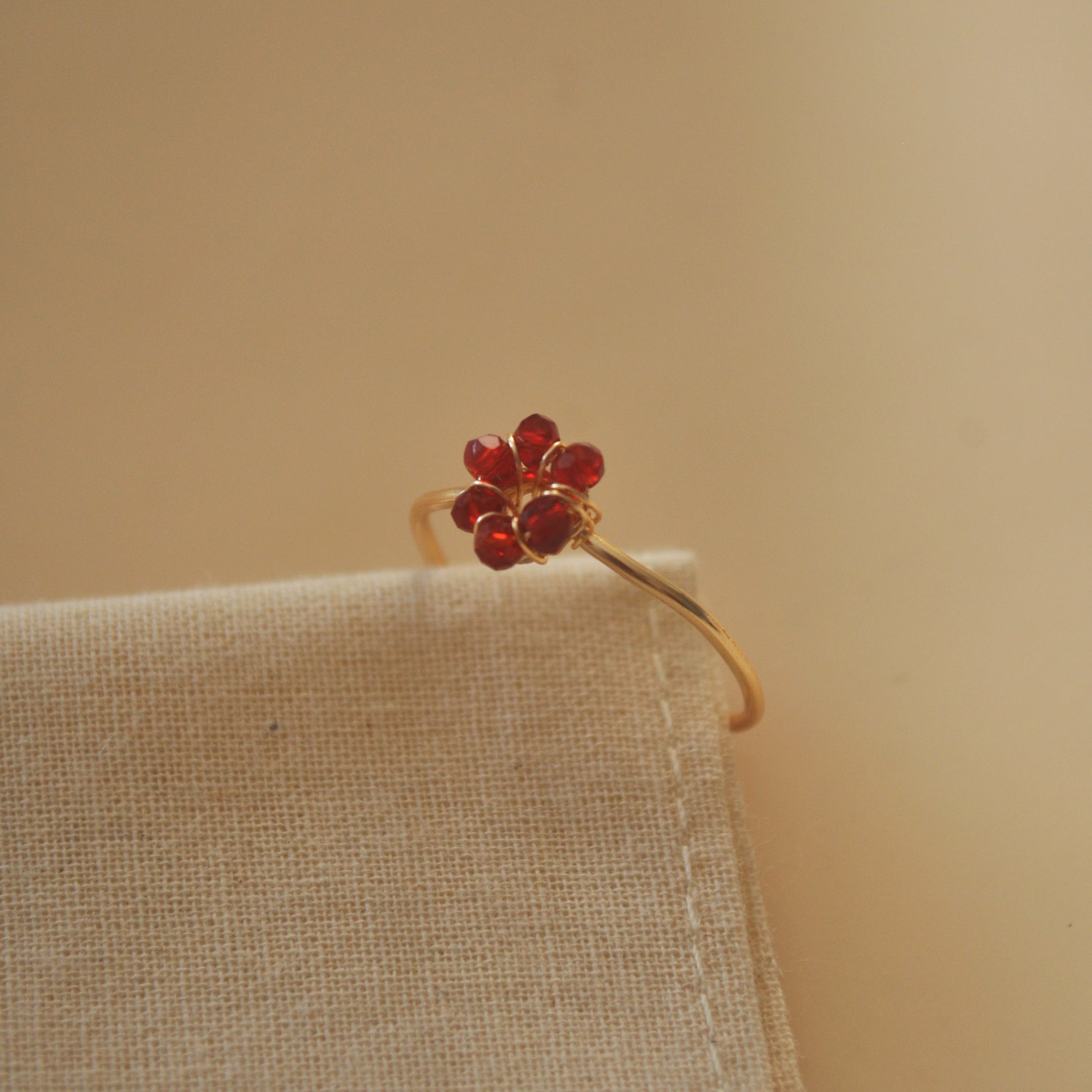 Hecho a mano con cristales color rubí y técnica alambrismo con baño de oro de 18K, son piezas hipoalergénicas que no destiñen.