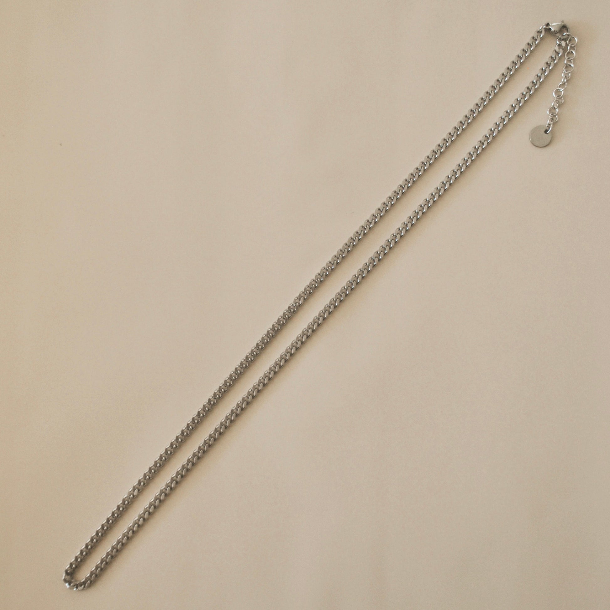 Cadena de acero inoxidable de eslabones planos entrelazados, diseño clásico y compacto.