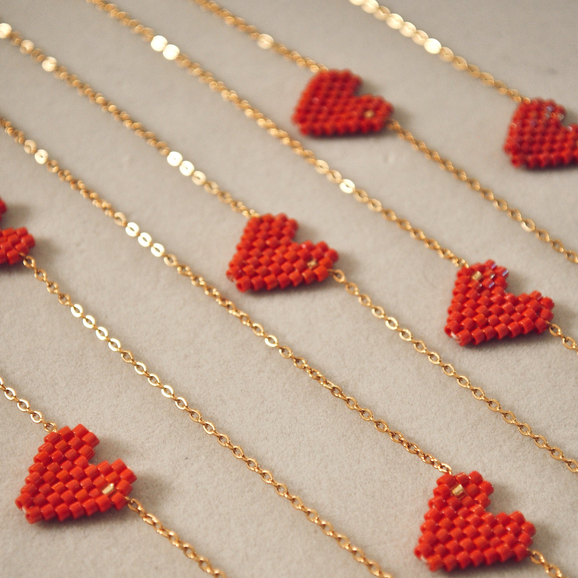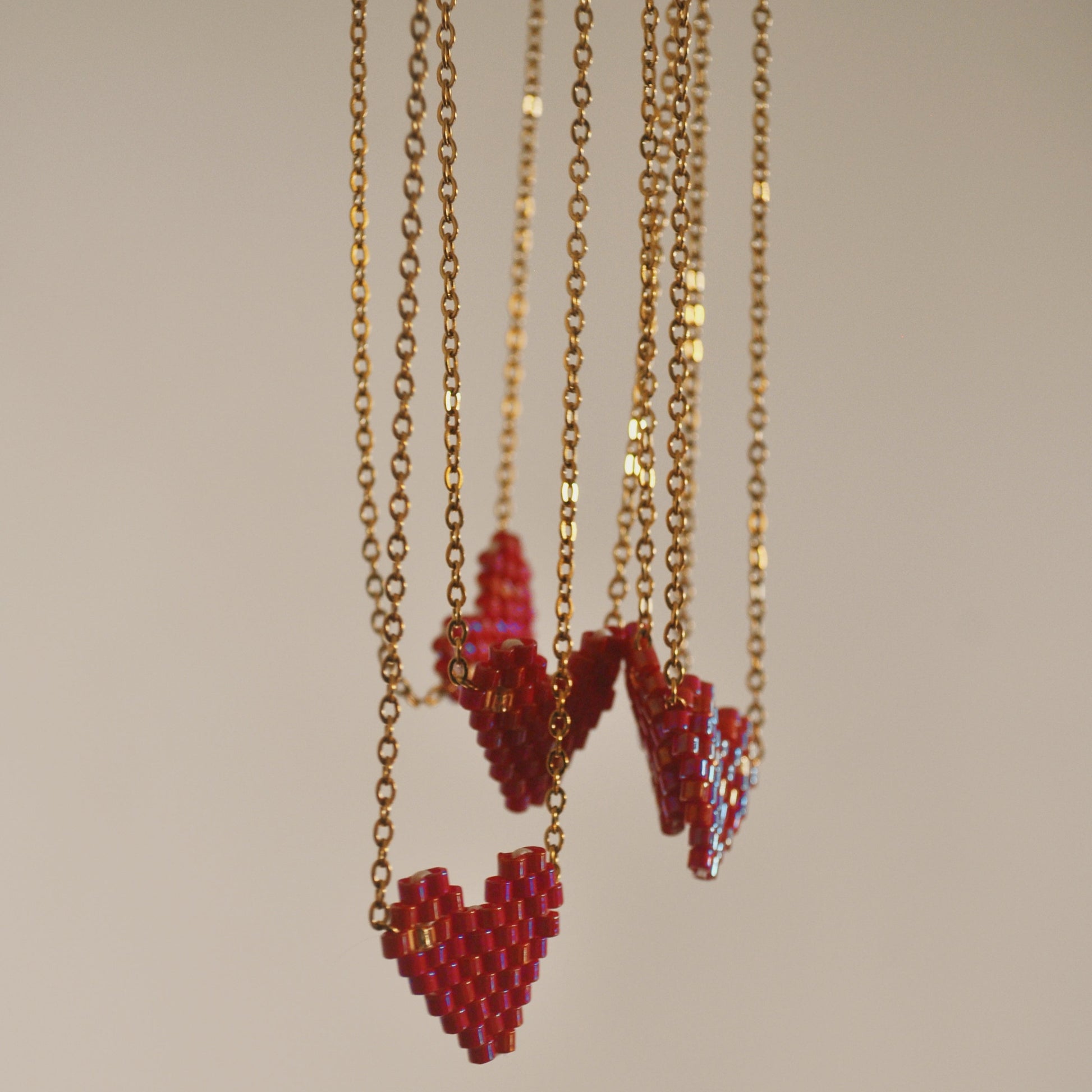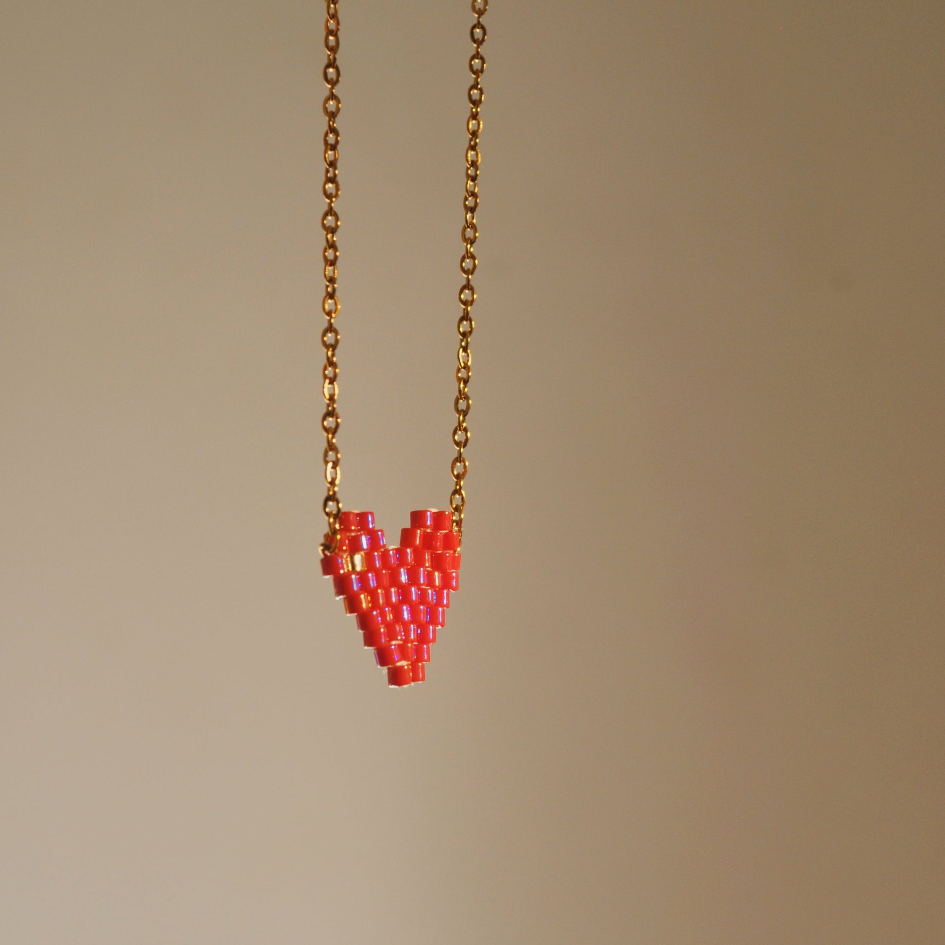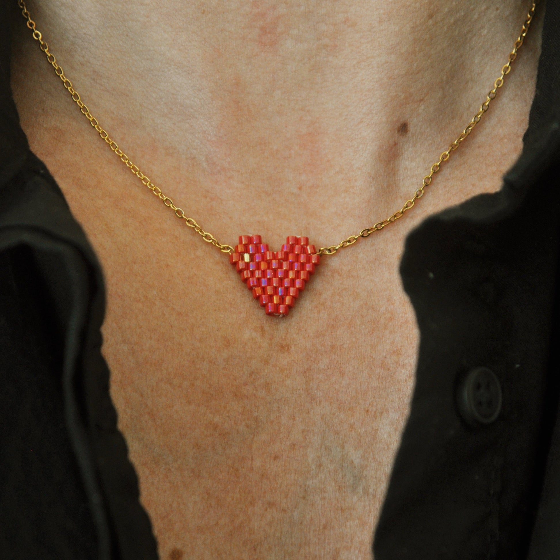 Nota importante: Recreamos a mano el corazón miyuki adaptándolo a un collar. No hay un único diseñador original del patrón de corazón en Miyuki Delica, ya que el diseño de un corazón en mostacillas es un patrón universal que ha sido recreado y adaptado por diferentes artesanos a lo largo del tiempo. Sin embargo, hay diseñadores populares como Coco Beads, Simple Bead Patterns y Julia S. Pretl, quienes han publicado patrones de corazones en distintas técnicas de tejido con Miyuki Delica.