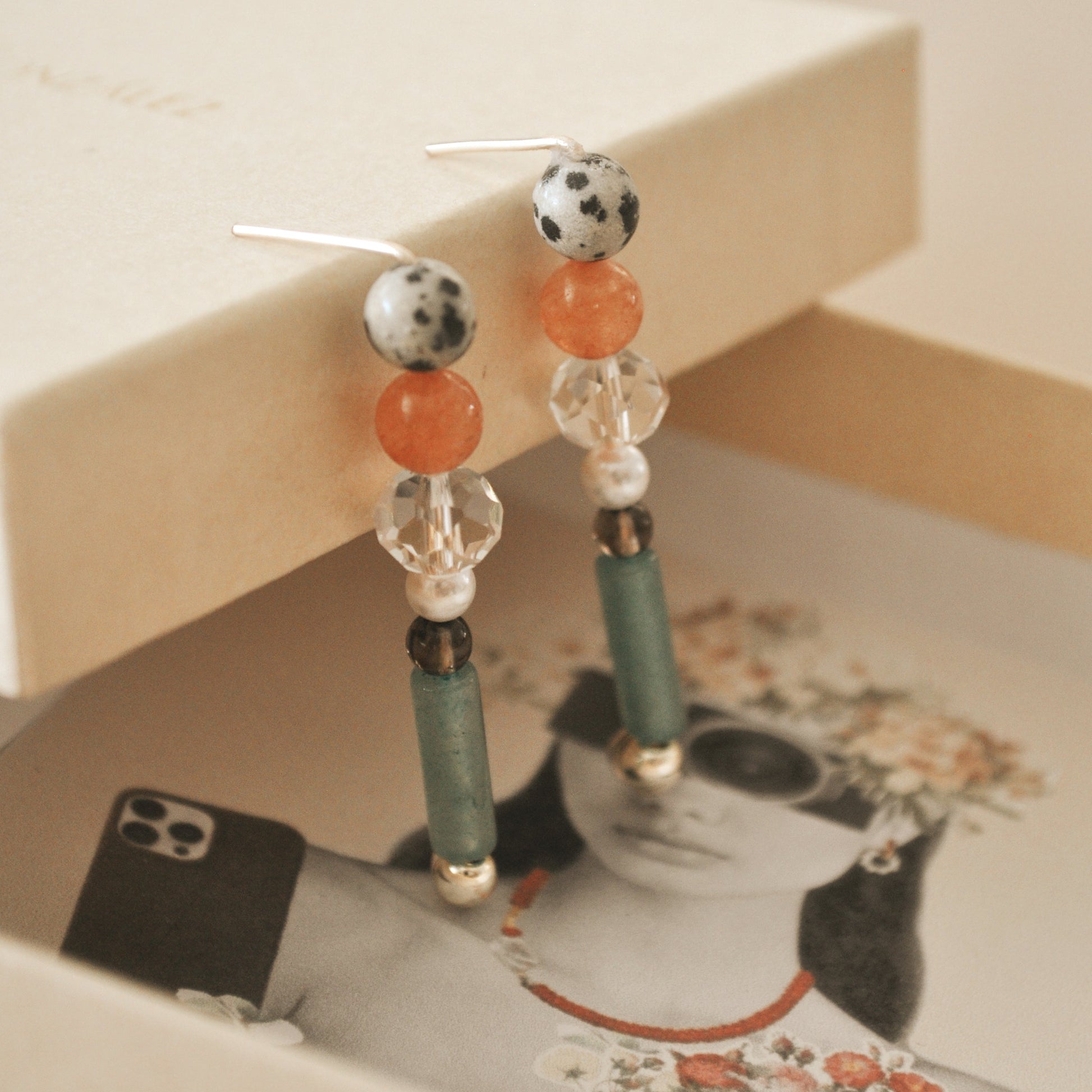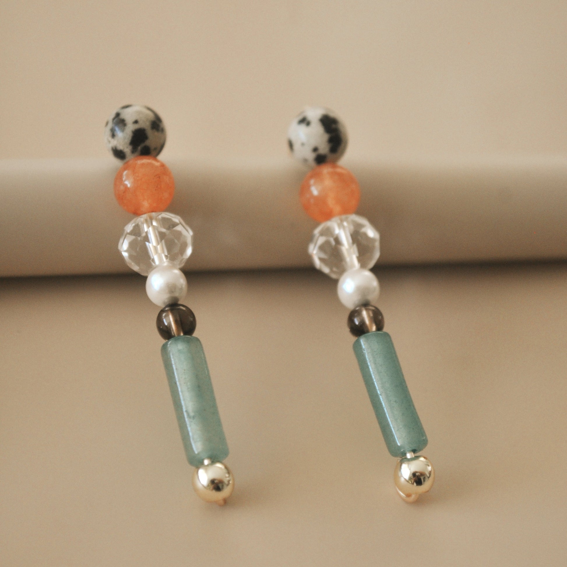 Fue creado a partir de una combinación de diferentes tipo de piedras naturales y base de cobre con recubrimiento AAA baño de oro de 14k, hipoalergénicos.