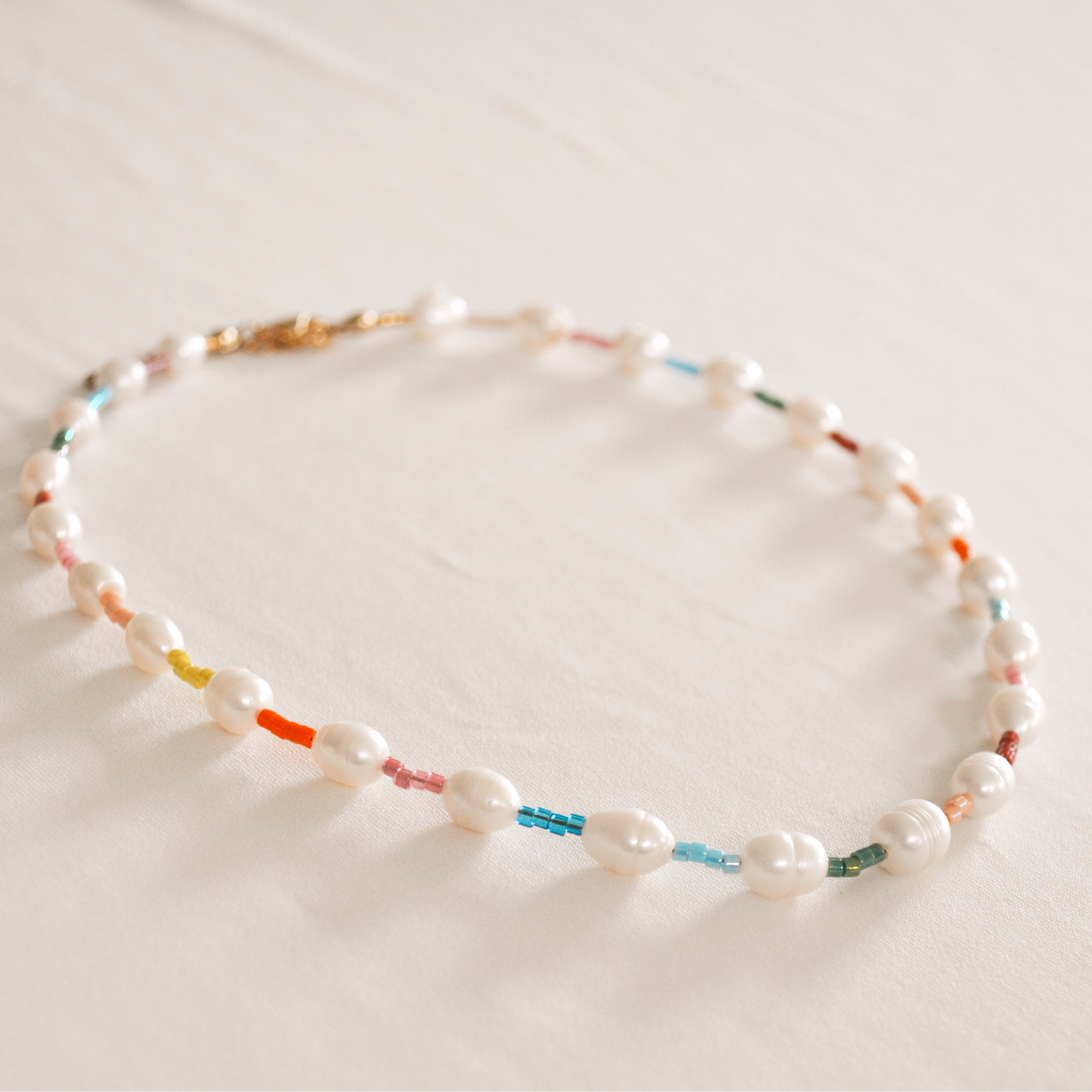 Gargantilla de 39cm más 6 cm de extensión en acero inoxidable. Combinación de mostacillas de vidrio japonesas con perlas naturales nácar.