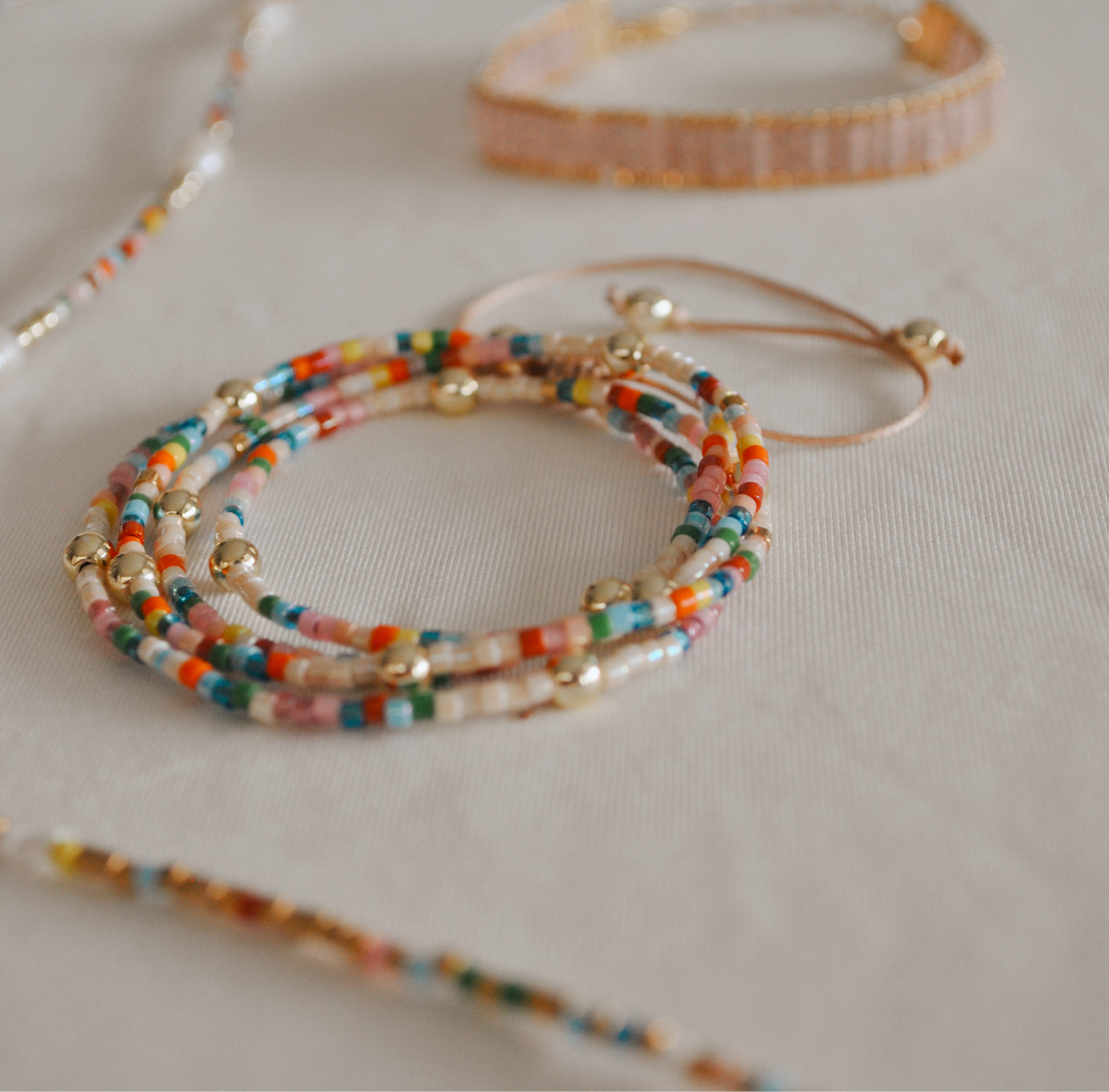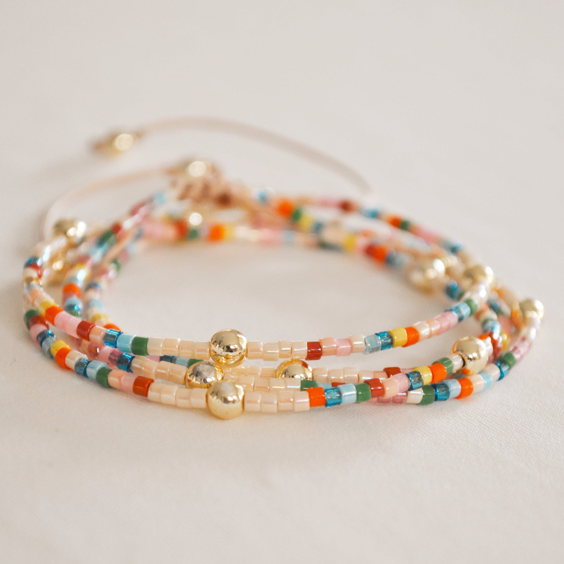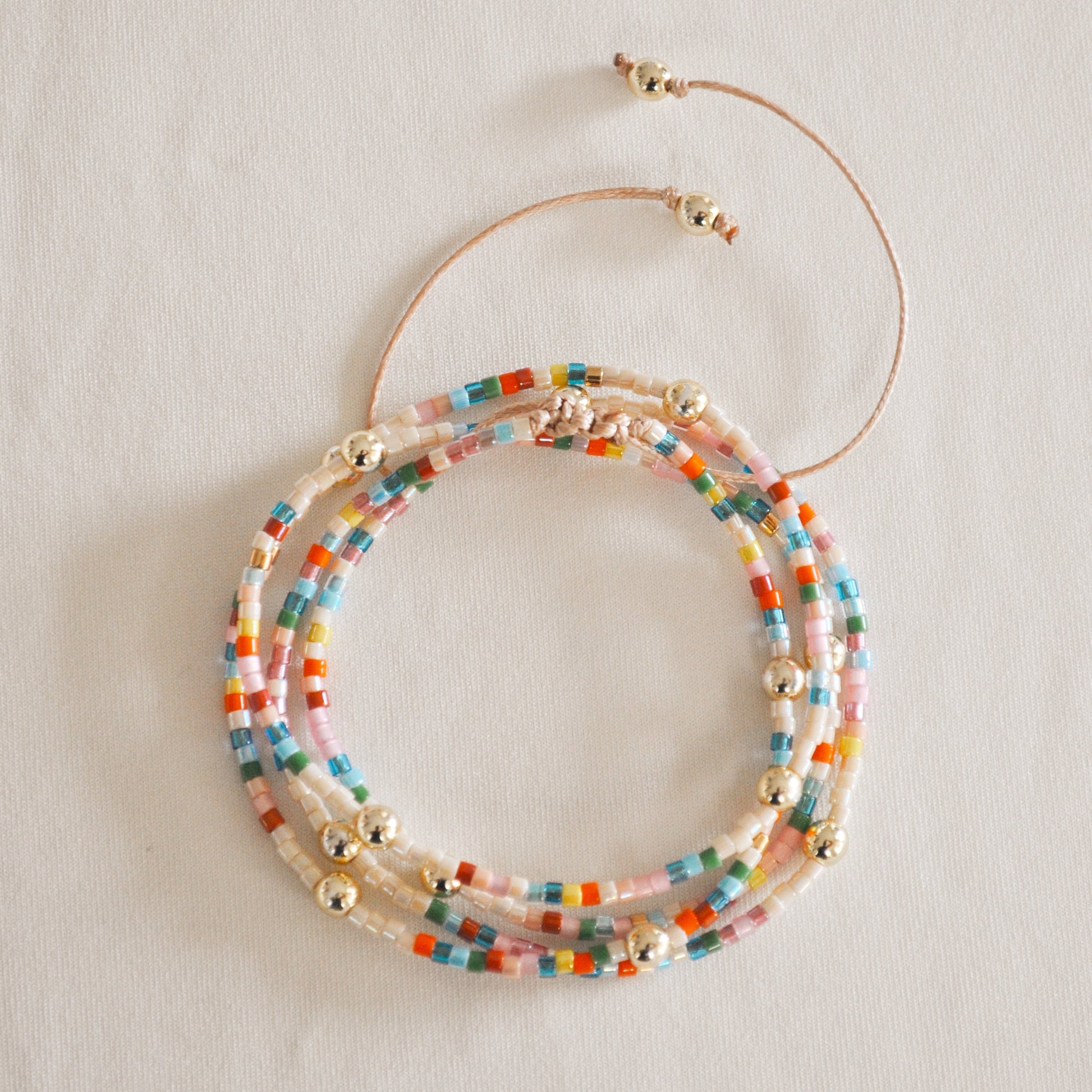 Pulsera ajustable de hilo hecha con miyuki de colores y piedras naturales bañadas en dorado. Da 4 vueltas a la muñeca. Verifica bien la talla, utilizando un centímetro y midiendo la muñeca, posicionando el centímetro sobre el huesito de la muñeca. Cualquier duda nos puede localizar via whatsapp en el icono que aparece abajo a la derecha.