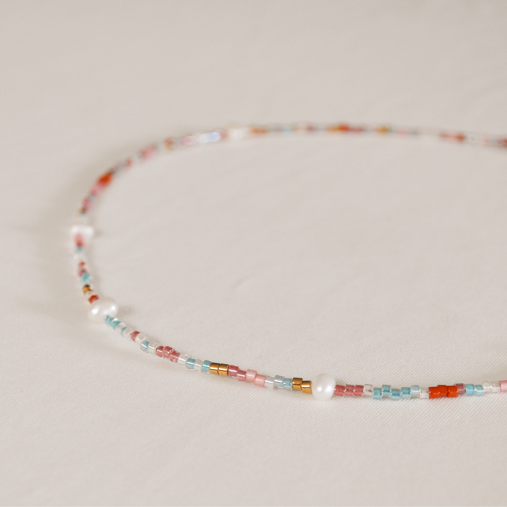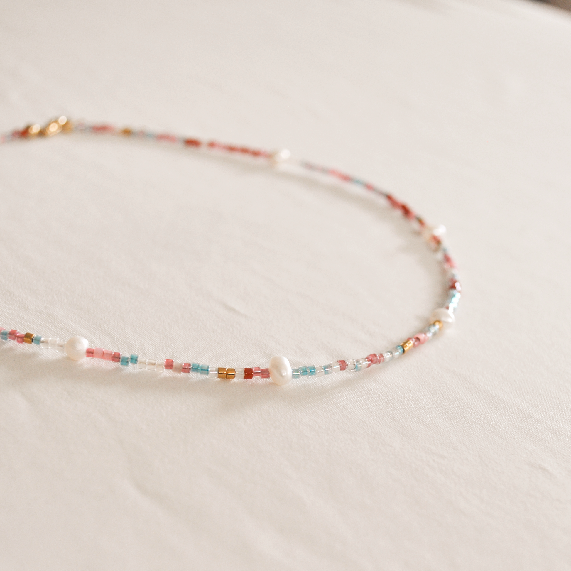 Collar de 44cm más 3cm de extensión en acero inoxidable, es una combinación de color con mostacillas de vidrio japonesas, piedras naturales bañadas en oro y perla natural nácar.