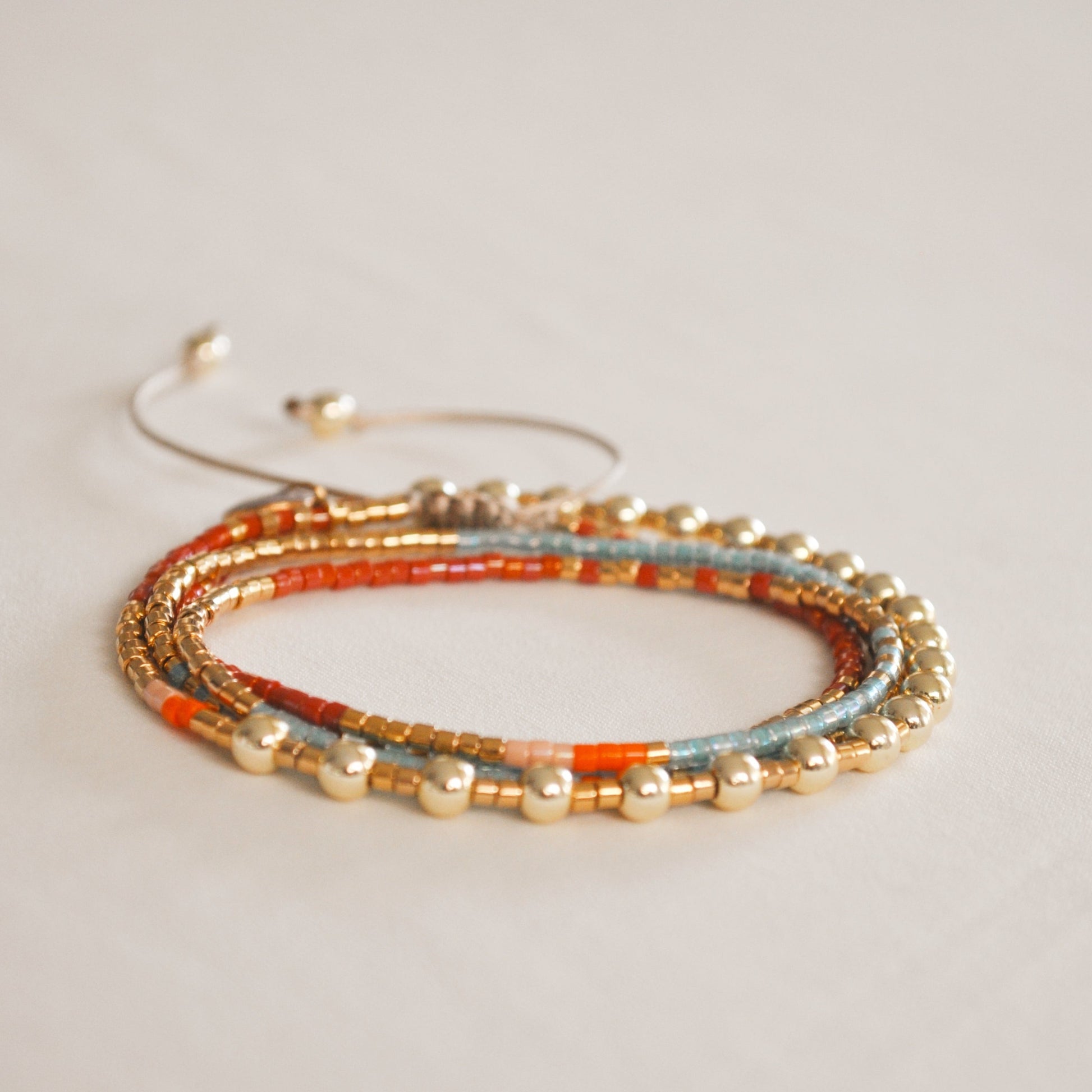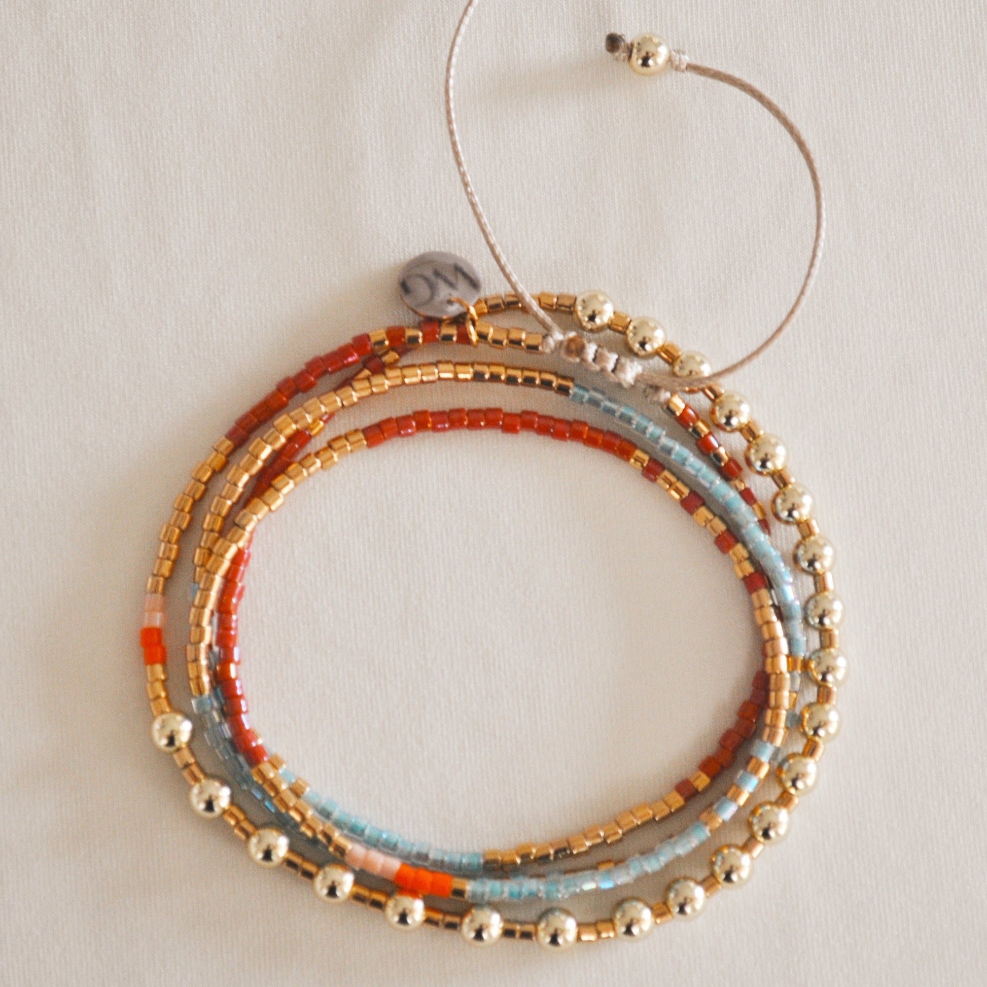 Pulsera ajustable de hilo hecha con miyuki de colores y piedras naturales bañadas en dorado. Da 4 vueltas a la muñeca. Verifica bien la talla, utilizando un centímetro y midiendo la muñeca, posicionando em centímetro sobre el huesito de la muñeca. Cualquier duda nos puede localizar via whatsapp en el icono que aparece abajo a la derecha.