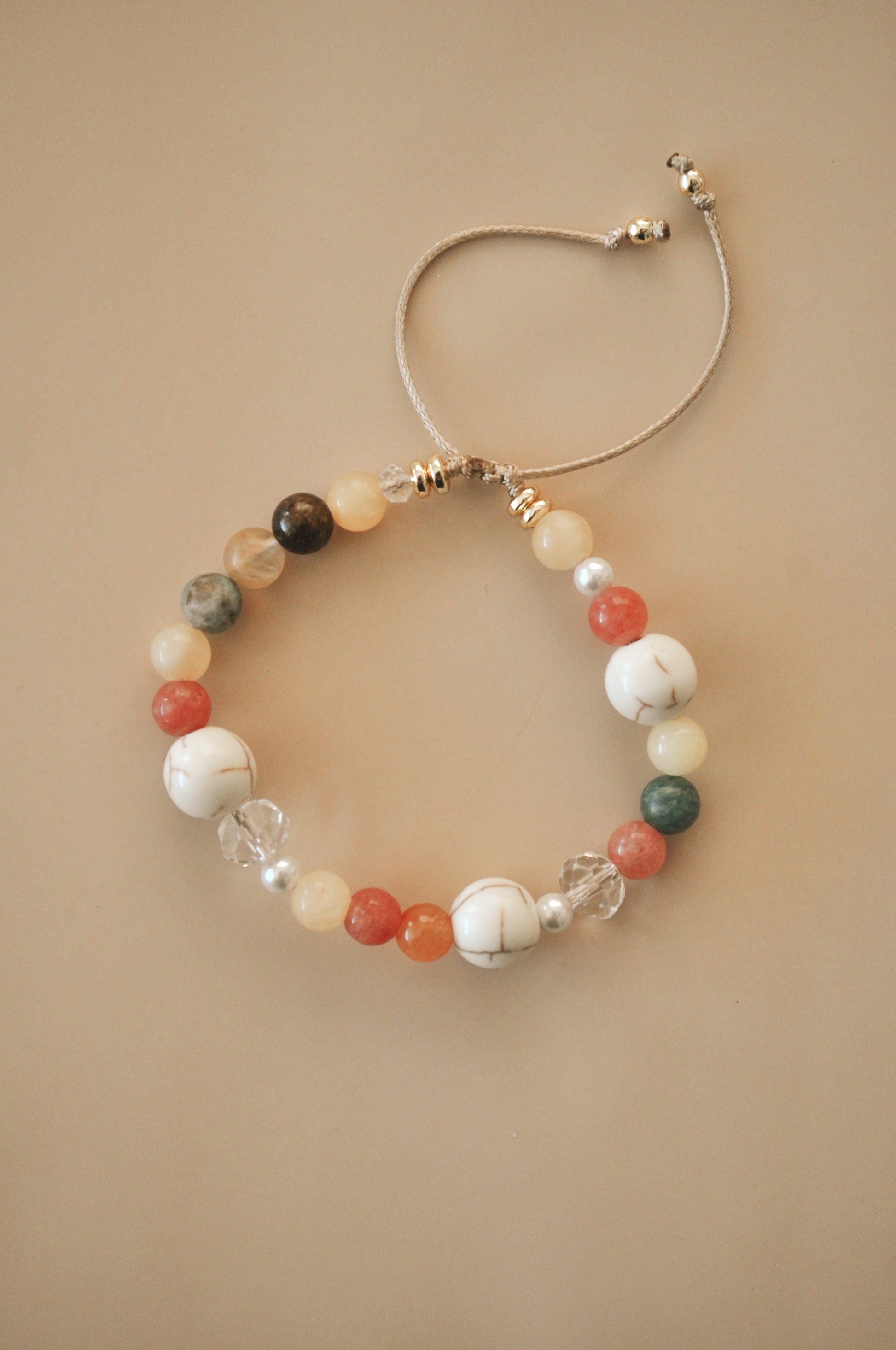 Ajustable. Fue creada a partir de una combinación de diferentes tipo de piedras naturales y de hilo beige.